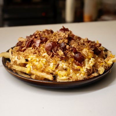 Price: 11,90€ Menu: Patatas 🍟 Author: victor Patatas fritas con salsa la pepa, bacon, cebolla crujiente y queso gratinado.