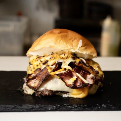 Carne de vacuno puro estilo smash, queso philadelphia, queso cheddar, queso semicurado, mix de quesos y bacon. Con patatas fritas. 🪤🧀