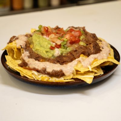 Price: 12,80€ Menu: Entrantes Author: victor Con pull pork, guacamole, salsa bacon, pico de gallo y queso gratinado.