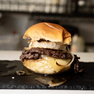 Doble carne de vacuno puro estilo smash 🍔 con un medallon de queso de cabra, queso curado, cebolla caramelizada y reducción de PX. Con patatas fritas.